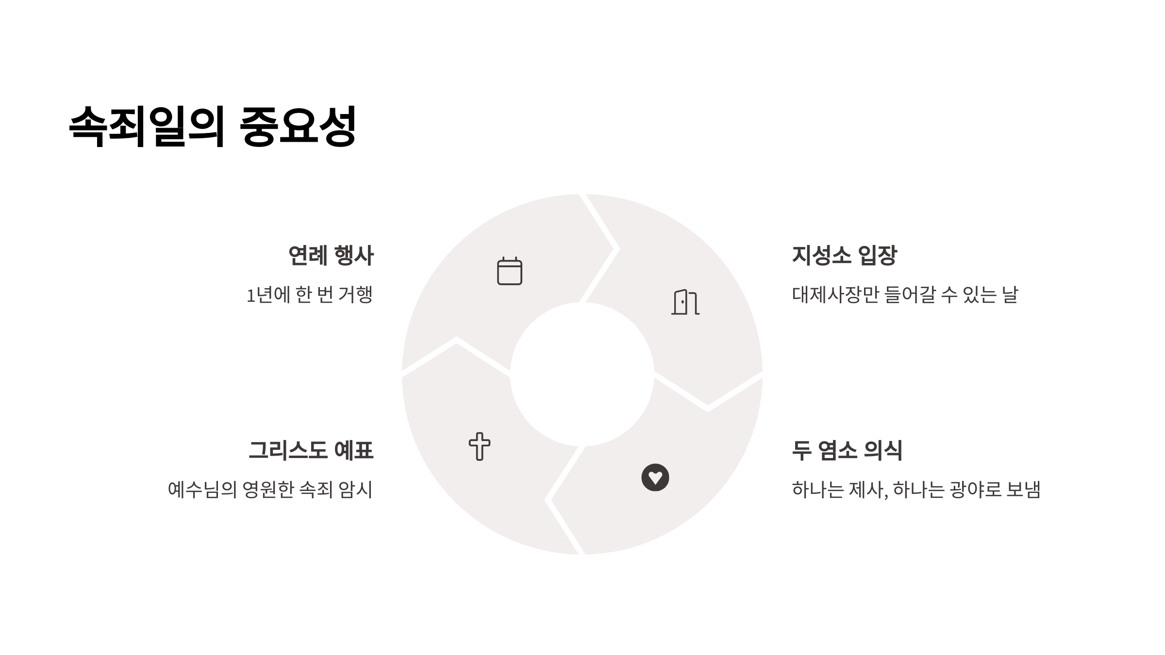 - 1년에 한 번, 대제사장이 지성소에 들어가 백성의 죄를 속죄해요.