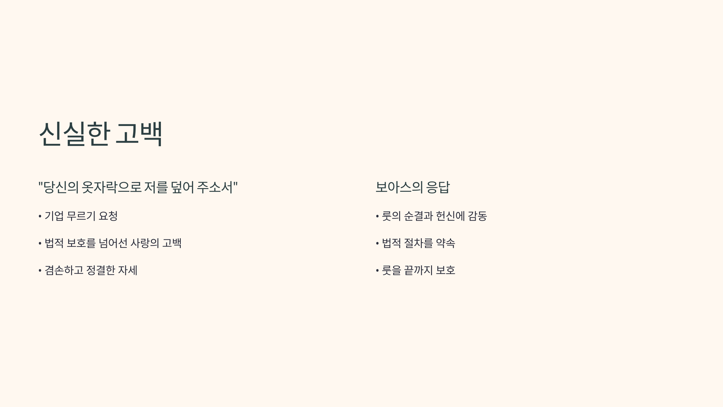 - 룻은 겸손하고 정결한 자세로 보아스를 찾아가, 율법적 요청이자 사랑의 고백을 전해요.
