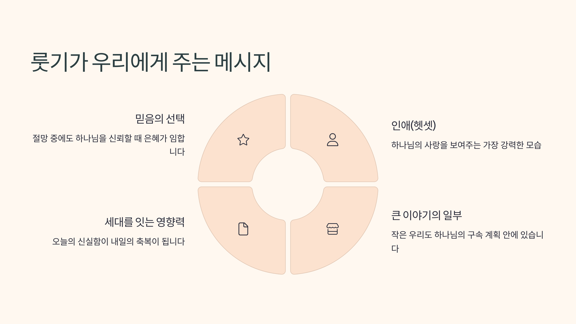 | 룻의 결단 | “하나님의 백성과 함께 하겠습니다” |
