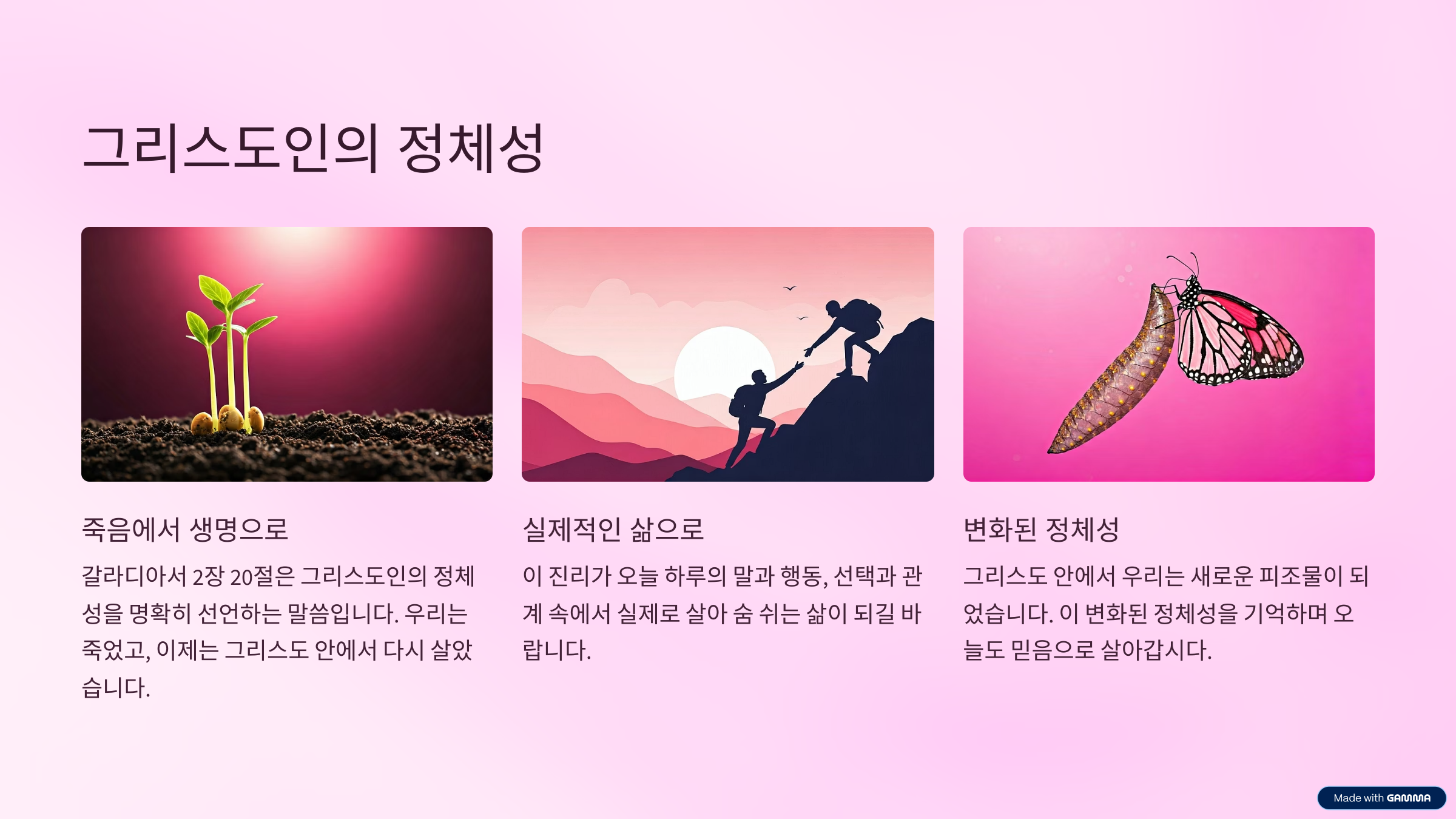 갈라디아서 2장 20절은 그리스도인의 정체성을 명확히 선언하는 말씀입니다.