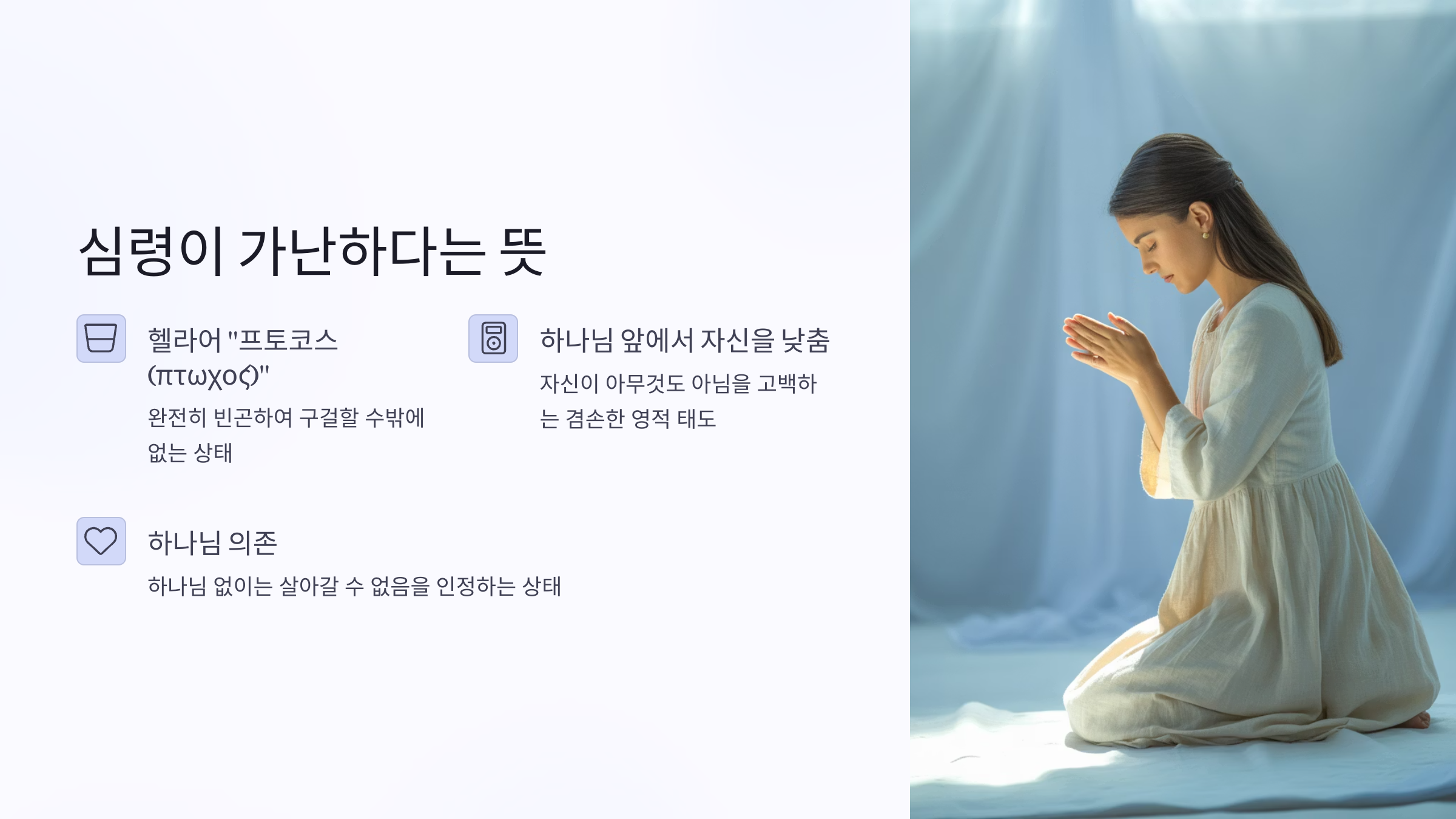 📌 즉, 심령이 가난하다는 말은 하나님 앞에서 나는 아무것도 아닌 존재이며, 그분 없이는 살아갈 수 없음을 인정하는 상태입니다.