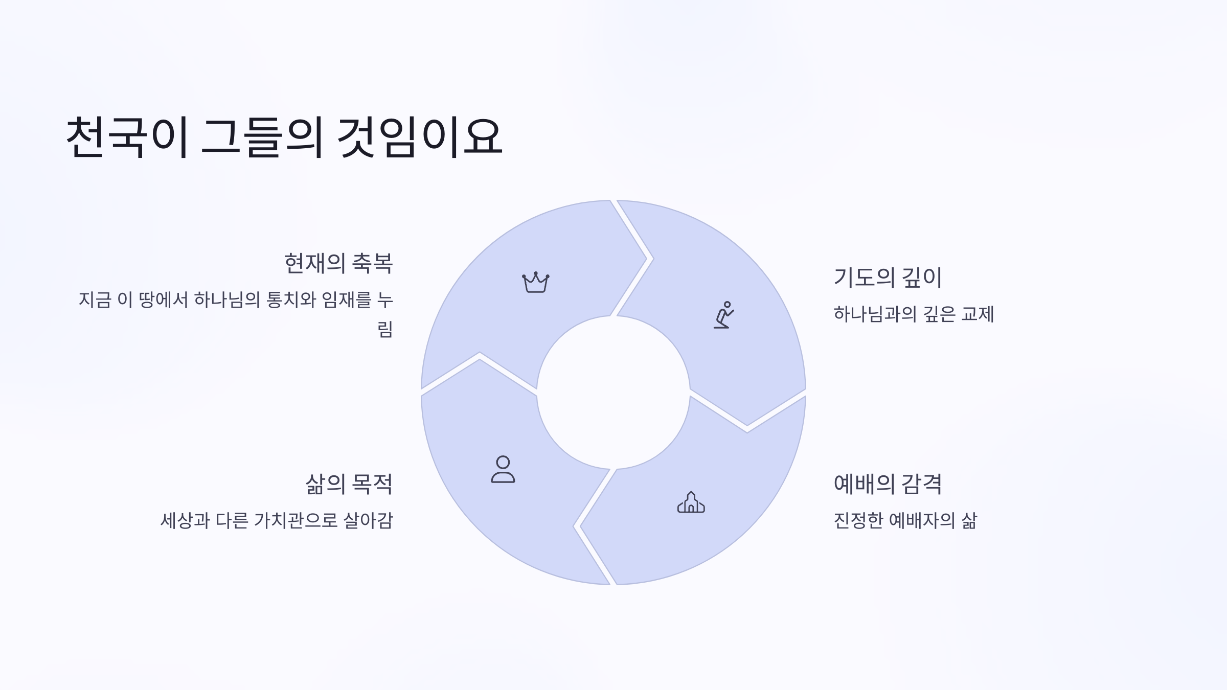 여기서 말하는 ‘천국’은 단지 죽은 후에 가는 장소가 아니라, 지금 이 땅에서 하나님의 통치와 임재를 누리는 삶을 의미합니다.