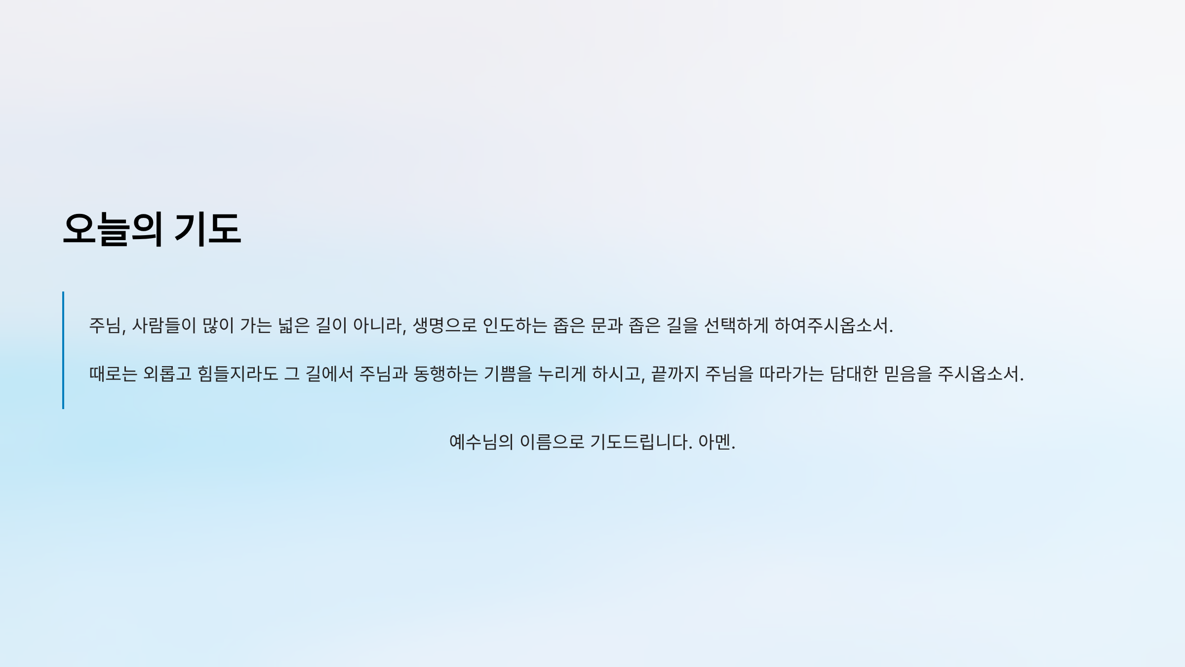 생명으로 인도하는 좁은 문과 좁은 길을 선택하게 하여주시옵소서.