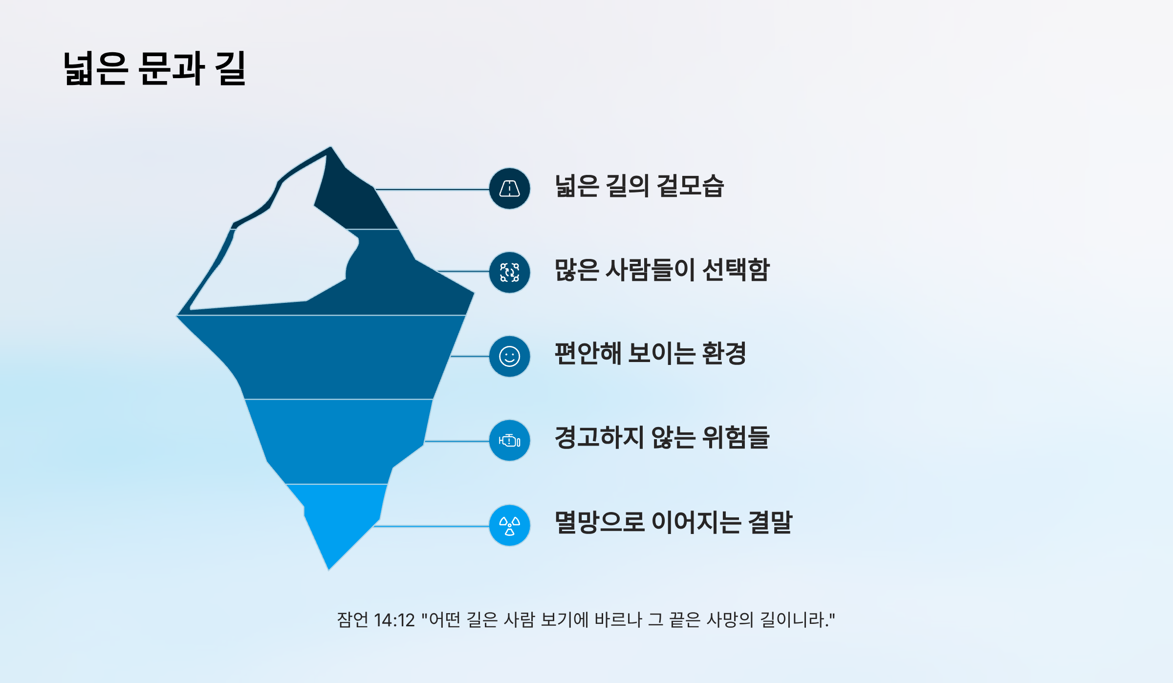 - 넓은 문은 사람들에게는 쉽고 익숙하지만, 그 끝은 멸망입니다.
