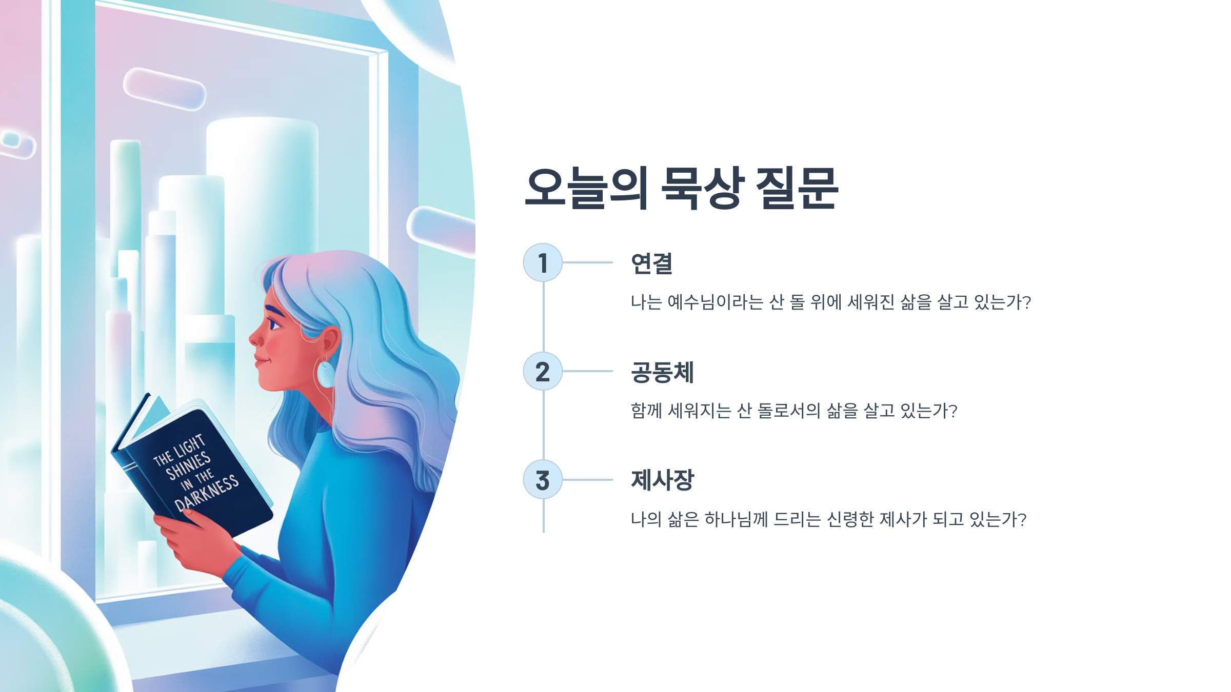 오늘도 이 말씀 위에 굳건히 서서 예수님과 연결되고, 교회 안에서 세워지며, 세상을 위한 빛으로 살아가는 하루 되시길 축복합니다.