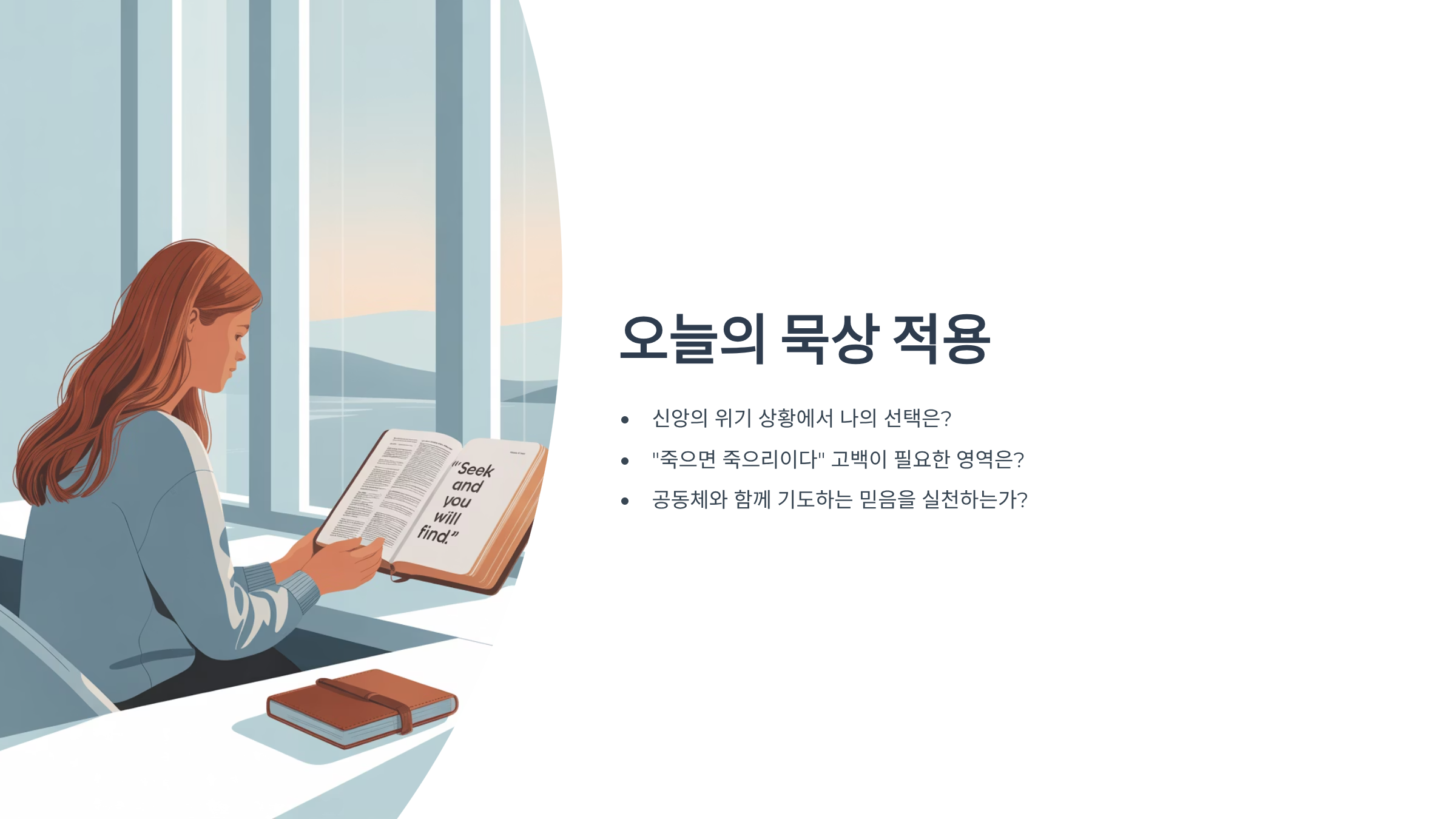 - 내 삶에 “죽으면 죽으리이다”라는 고백이 필요한 영역은 무엇인가?