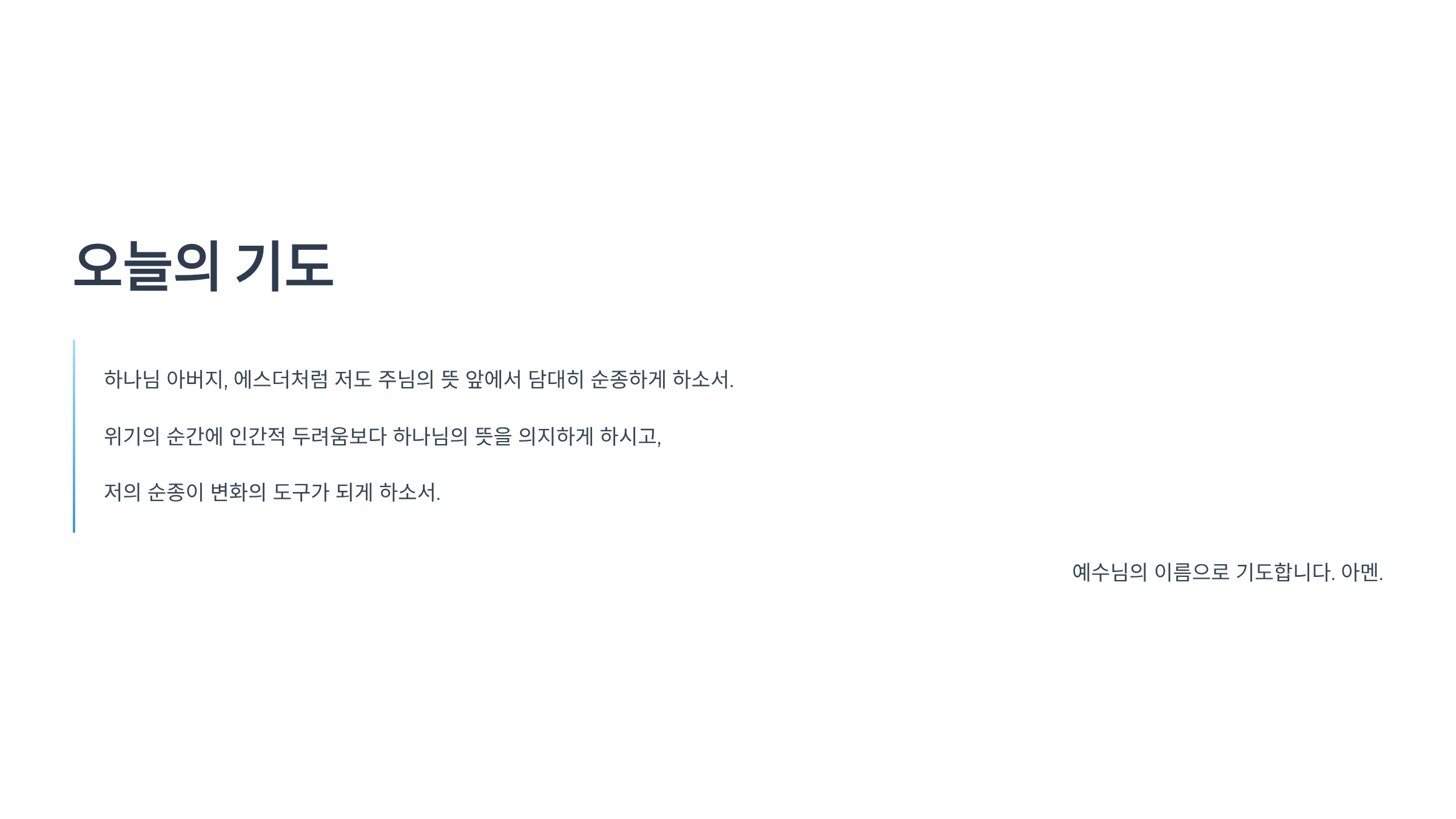 에스더가 민족을 위해 목숨을 건 결단을 내린 것처럼 저도 주님의 뜻 앞에서 담대히 순종하게 하여주시옵소서.