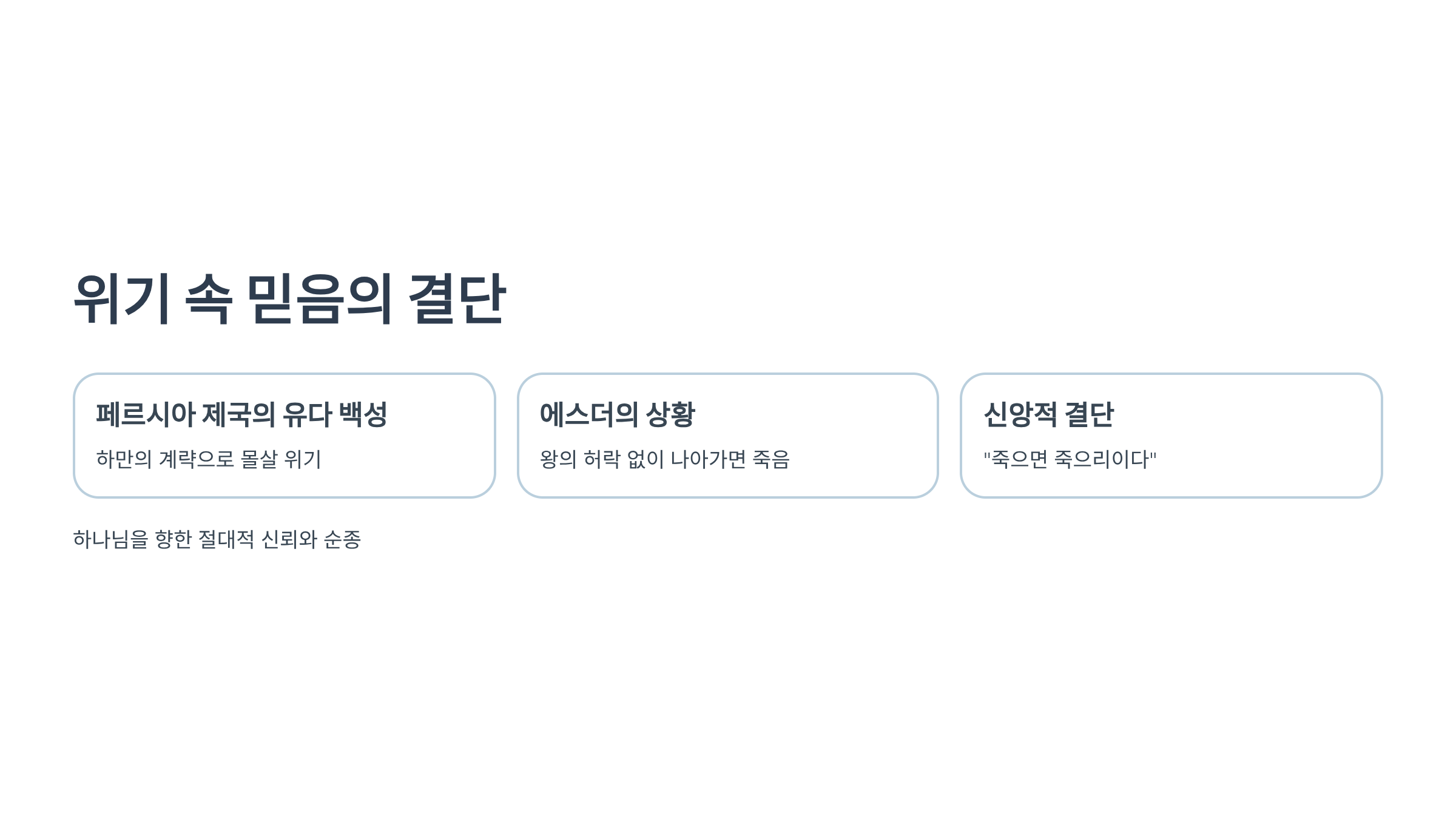 왕의 허락 없이 임금 앞에 나아가면 곧바로 죽을 수 있었지만, 에스더는 두려움을 넘어 “죽으면 죽으리이다”라는 신앙적 결단을 내립니다.