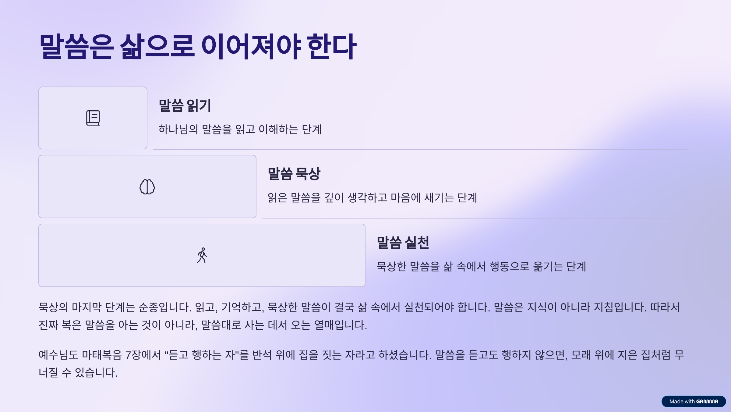 예수님도 마태복음 7장에서 “듣고 행하는 자”를 반석 위에 집을 짓는 자라고 하셨습니다.