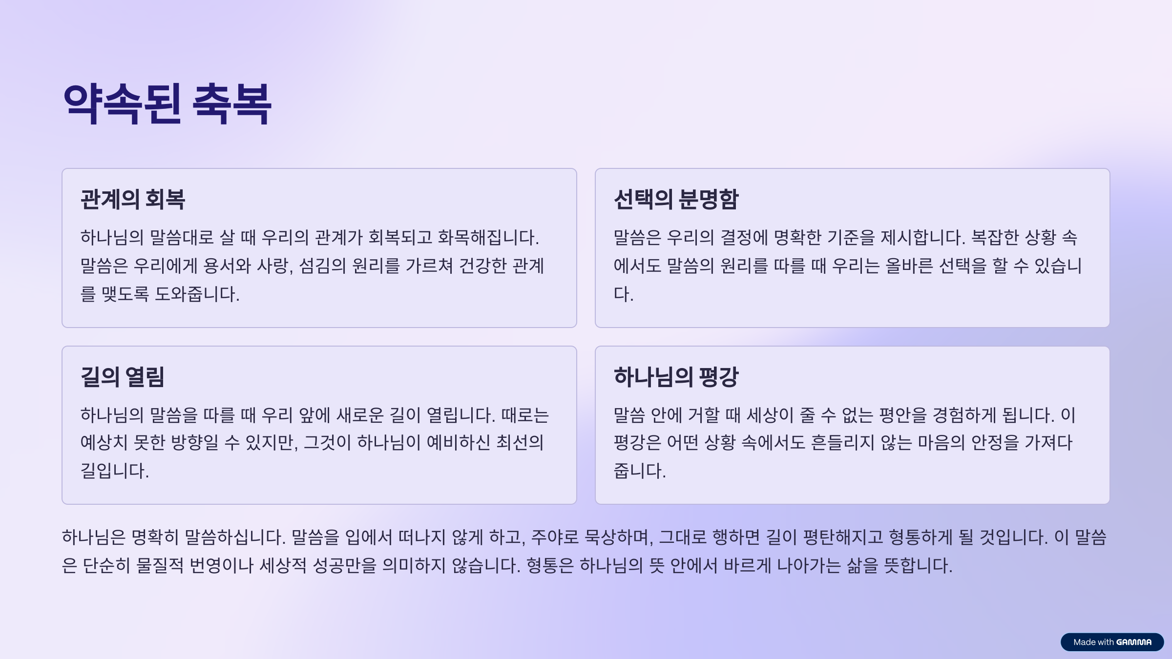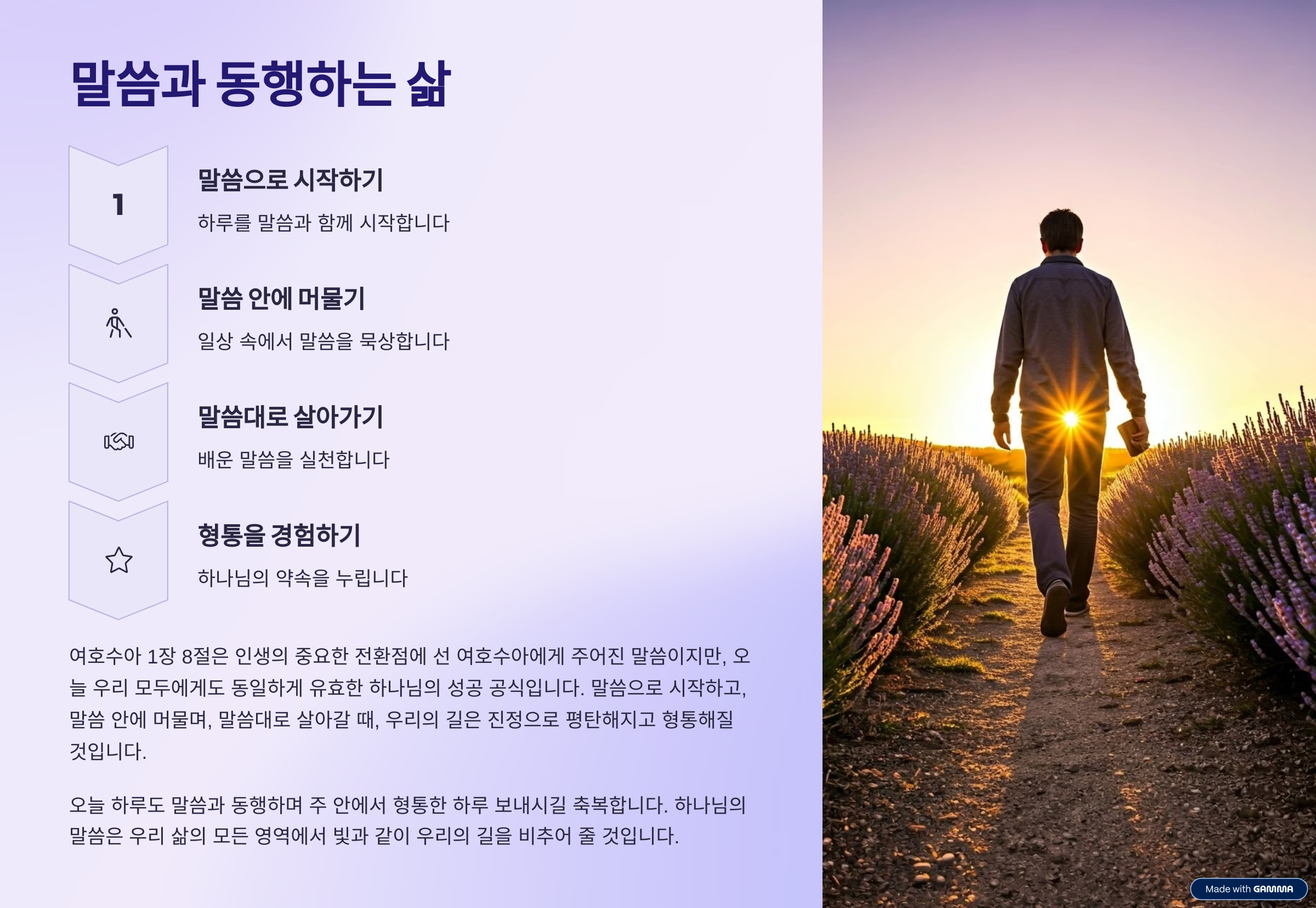 말씀으로 시작하고, 말씀 안에 머물며, 말씀대로 살아갈 때, 우리의 길은 진정으로 평탄해지고 형통해질 것입니다.