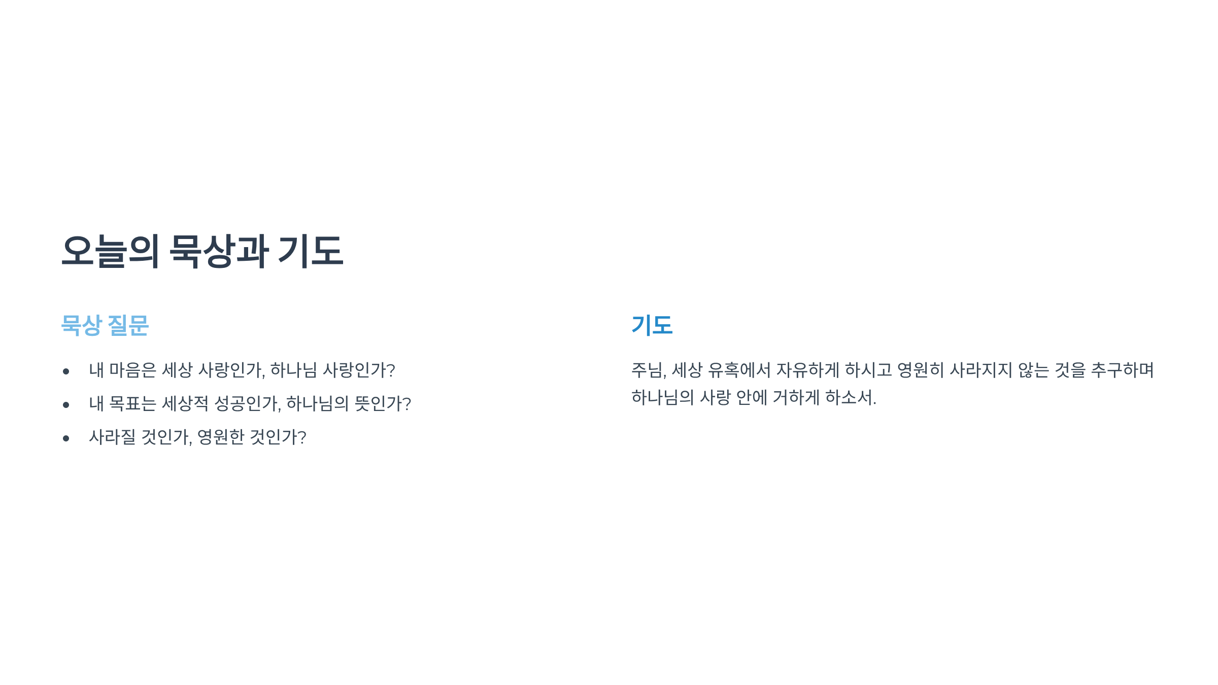 - 내가 추구하는 목표와 꿈은 세상적 성공에 더 가까운가, 아니면 하나님의 뜻에 맞는가?