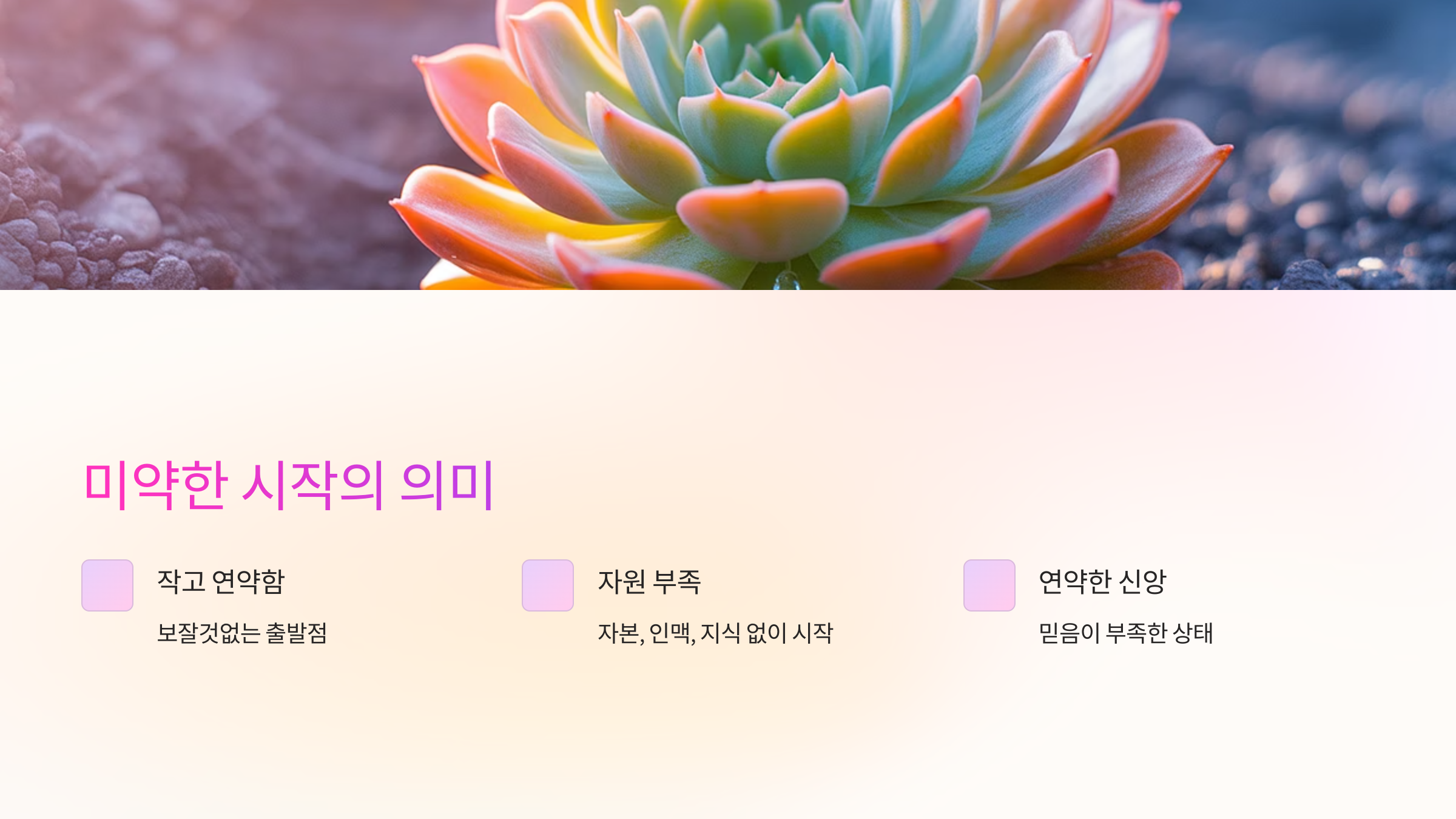 - 지금 나는 어떤 ‘미약한 시작’의 시간을 지나고 있나요?