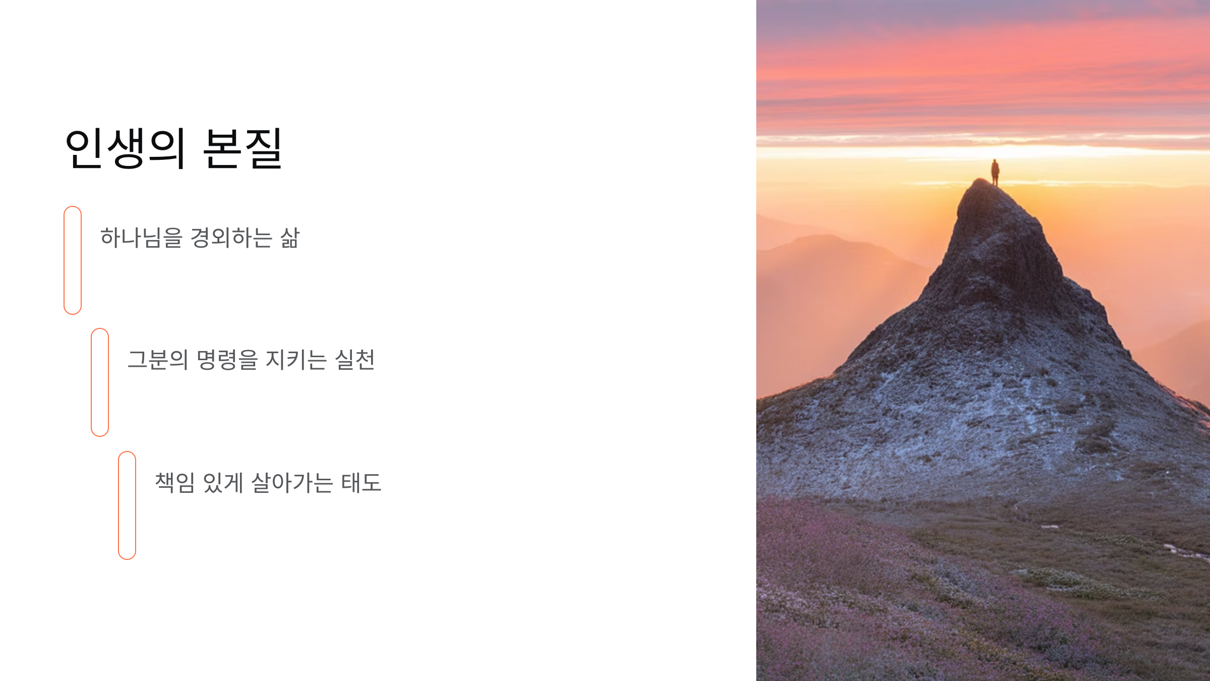 성공, 명예, 자기실현이 중요한 것이 아니라, 하나님을 경외하고 그분의 뜻에 따라 사는 것이 인간 존재의 이유라는 선언입니다.