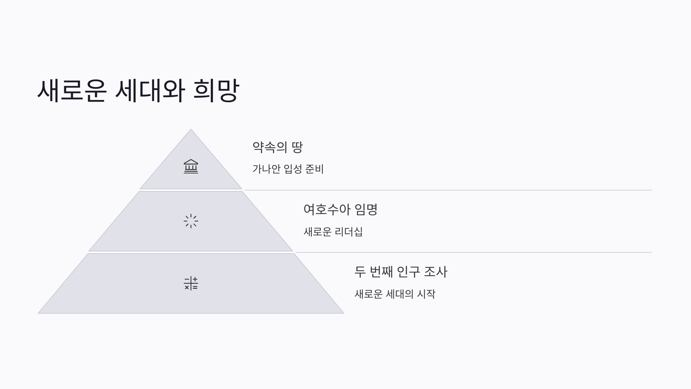 - 광야 40년 후, 첫 세대는 거의 다 죽고 새로운 세대가 등장합니다.