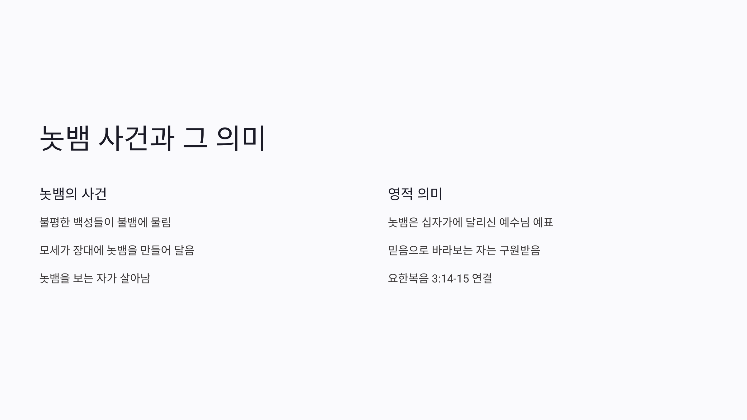 👉 놋뱀은 십자가에서 들린 예수님을 상징해요. 믿음으로 바라보는 자는 살아납니다!