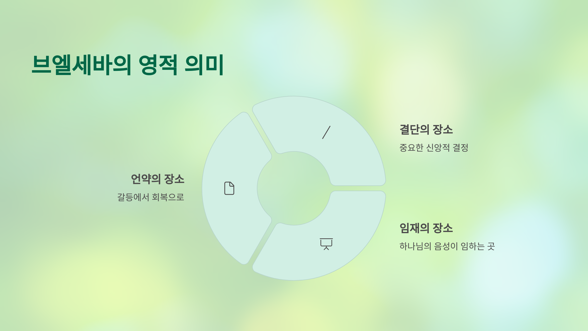 이곳은 기도와 묵상의 자리, 하나님의 응답이 임하는 자리였습니다. - 하나님이 임재하시는 장소: 인간의 갈등을 초월해 하나님께서 말씀하시고 인도하시는 거룩한 자리였습니다.