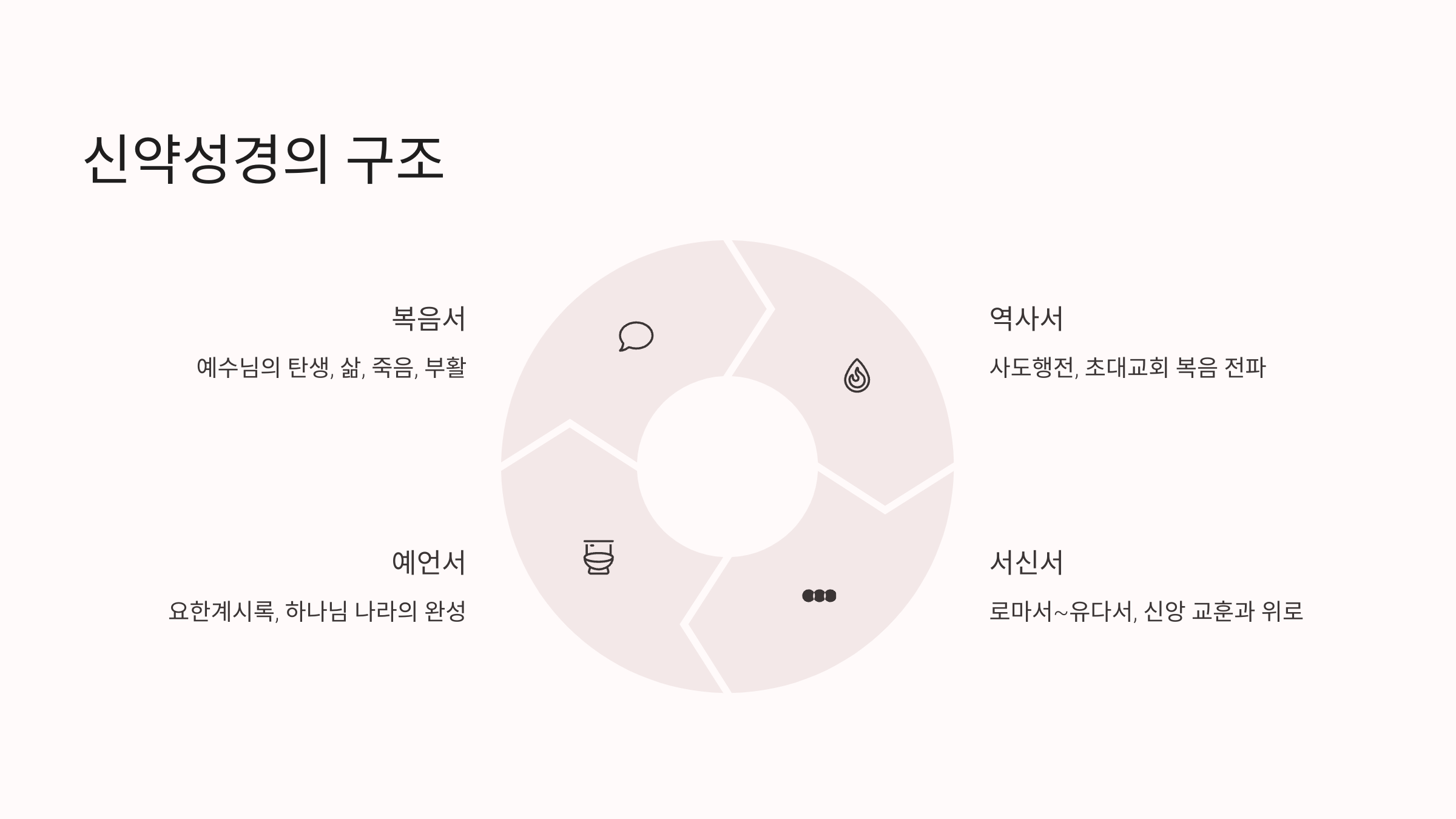- 예수님의 탄생, 삶, 죽음, 부활이라는 중심 메시지를 전합니다.