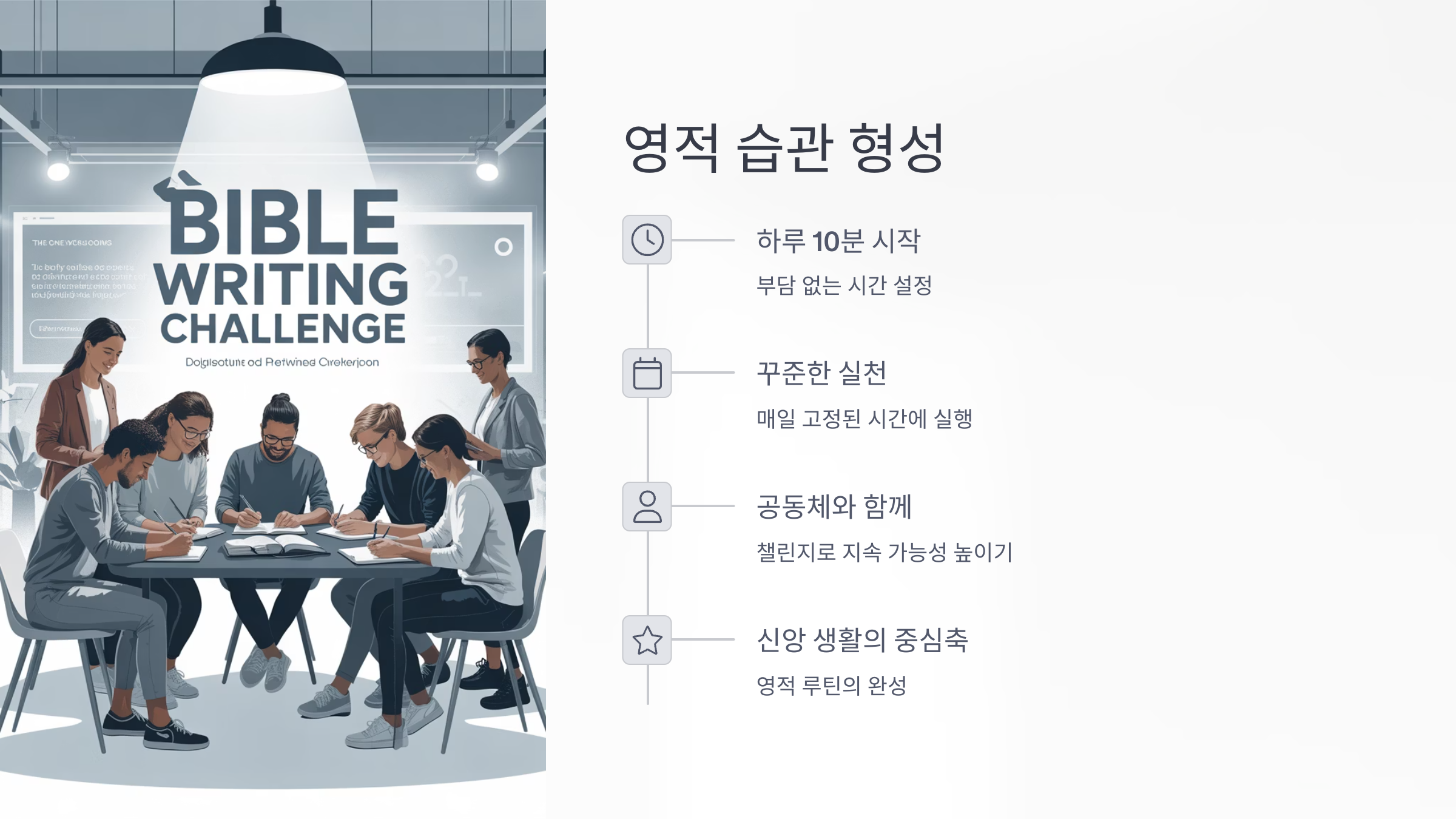성경 필사는 매일 실천할 수 있는 영적 루틴으로 탁월합니다. ‘하루 10분’이라는 부담 없는 시간 설정으로 시작할 수 있으며, 꾸준히 실천하면 신앙 생활의 중심축이 됩니다. ‘Scripture Writing Challenge’ 같은 챌린지를 통해 가족, 교회 공동체와 함께 실천하면 지속 가능성도 높아집니다.