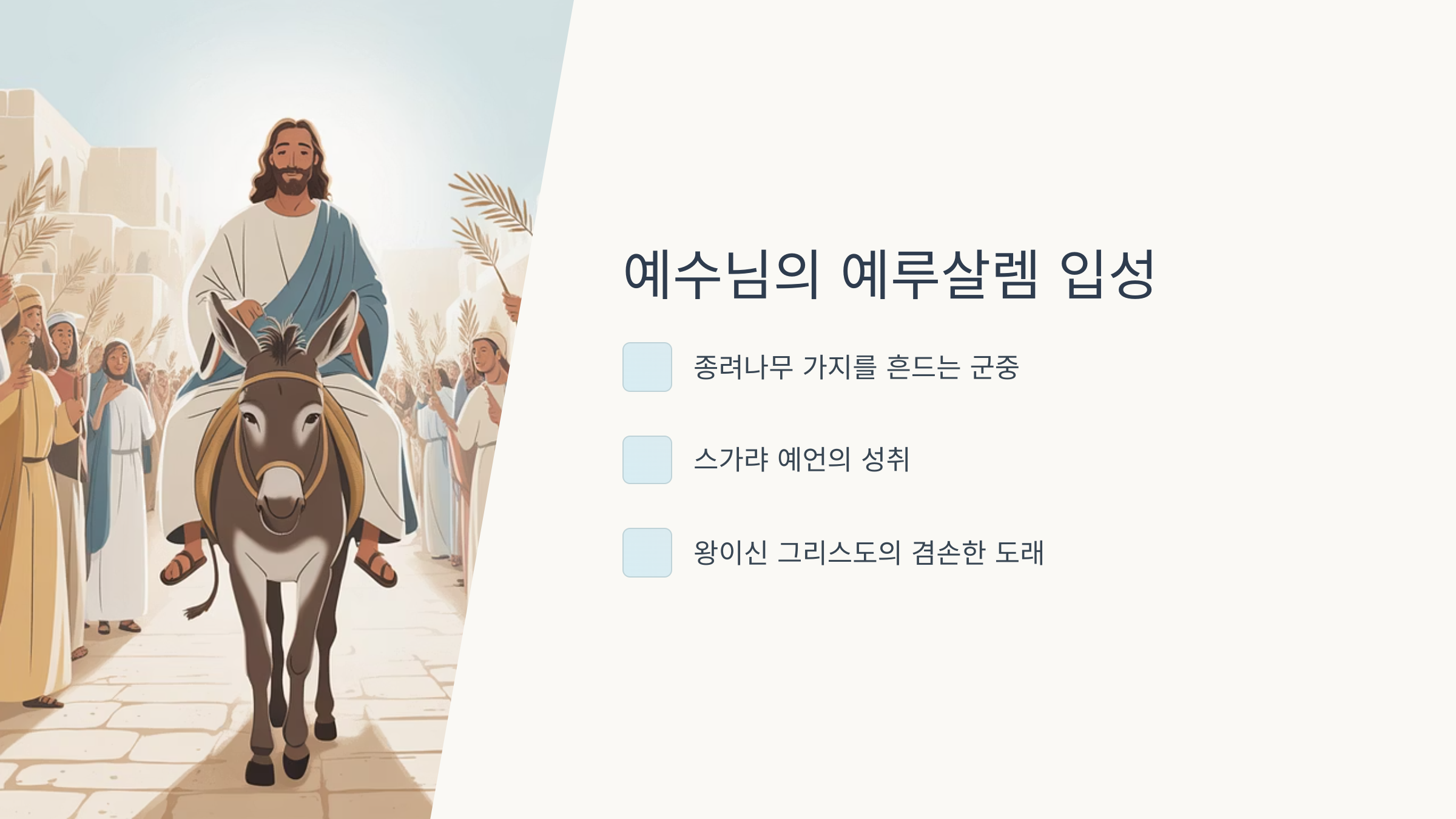 예수님은 종려나무 가지를 흔드는 군중들의 환호 속에 예루살렘에 입성하십니다. 이는 스가랴의 예언(슥 9:9)의 성취로, 왕이신 그리스도의 겸손한 도래를 보여줍니다.